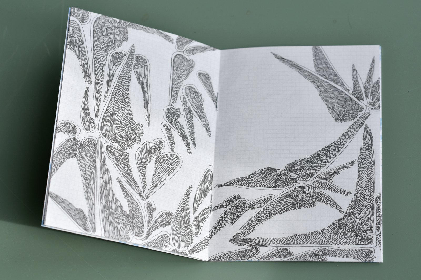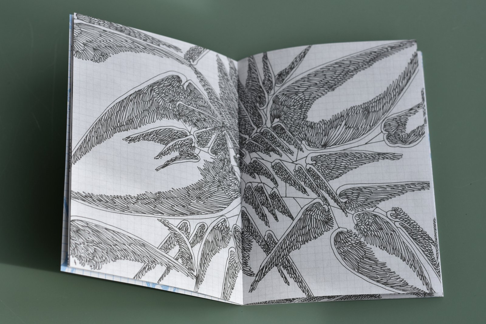 White Rabbit Prod, tout neuf éditeur, publie une collection de monographies A6 de dessinateurs contemporains. J’aime beaucoup ce format minizine. Le dernier opus « Plumes », présente une série de dessins au feutre (pas à la plume) de Céline Guichard : des ailes d’ange sans ange, détachées des corps, libres en apparence, simple motif répétitif s’arrangeant en agrégats nouveaux, se recréant des liens par d’intrigantes lignes droites qui transforment ces ailes en énigmatiques réseaux. L’ensemble dégage une étrange sérénité, mais est aussi hermétique que poétique. Hermétique au sens plein… Et plus qu’à une métaphore de « La chute des anges légitimistes » chère à Pierre Alenchisky, on pense à l’association symbolique des anges et d’Hermès en allégorie de la communication, par Michel Serres…