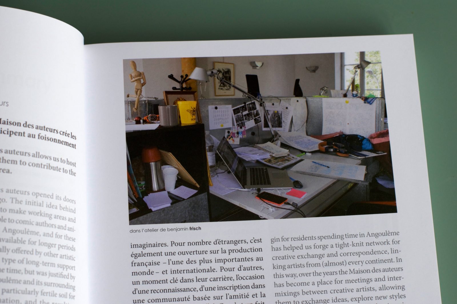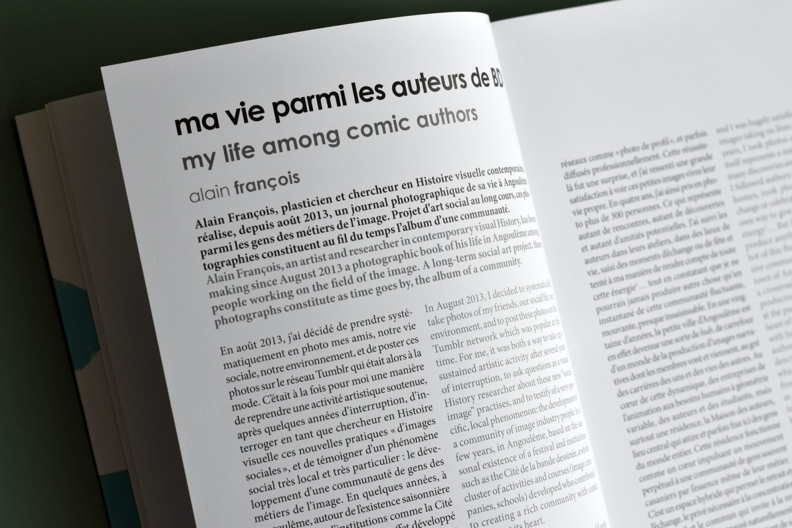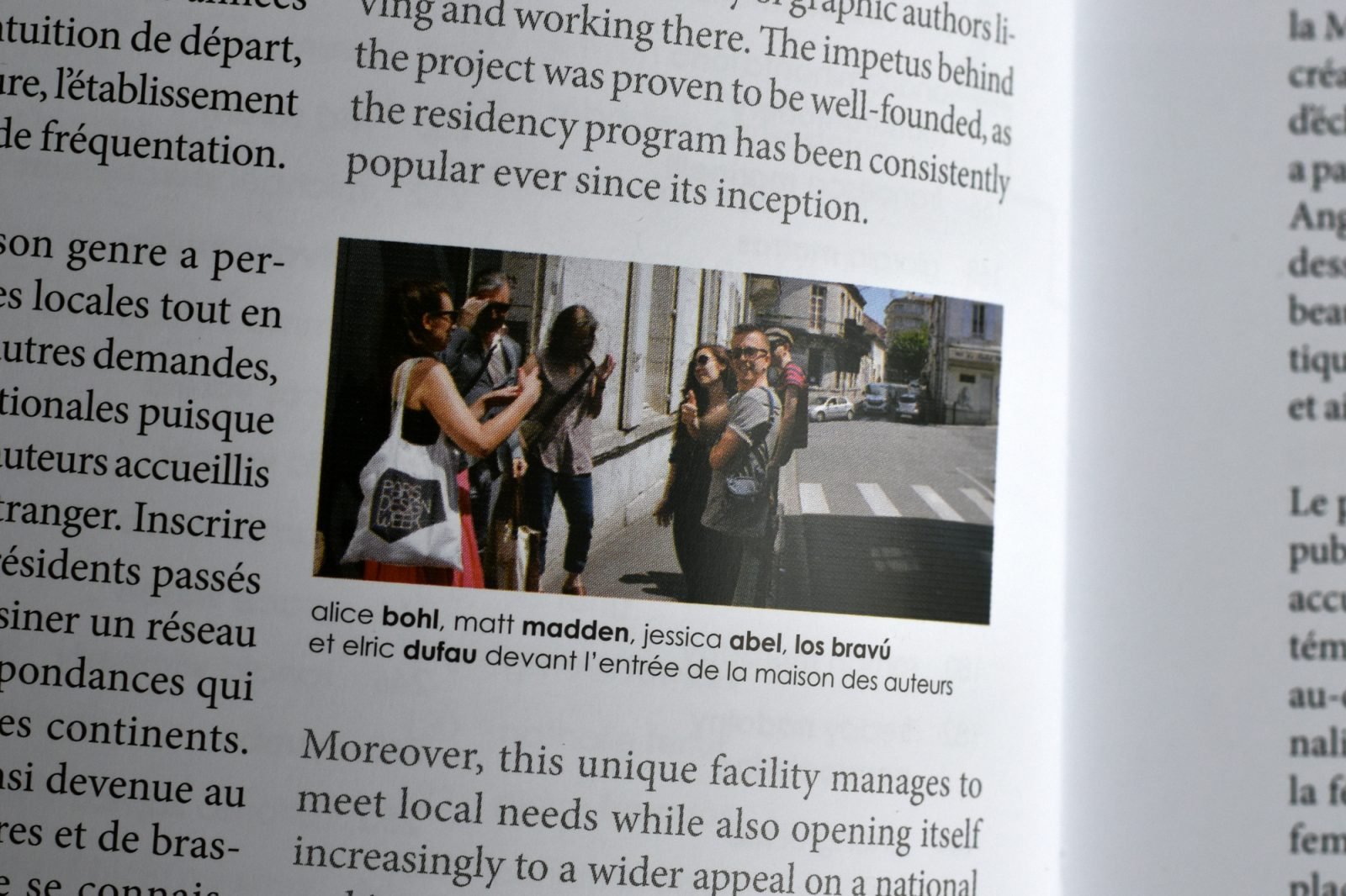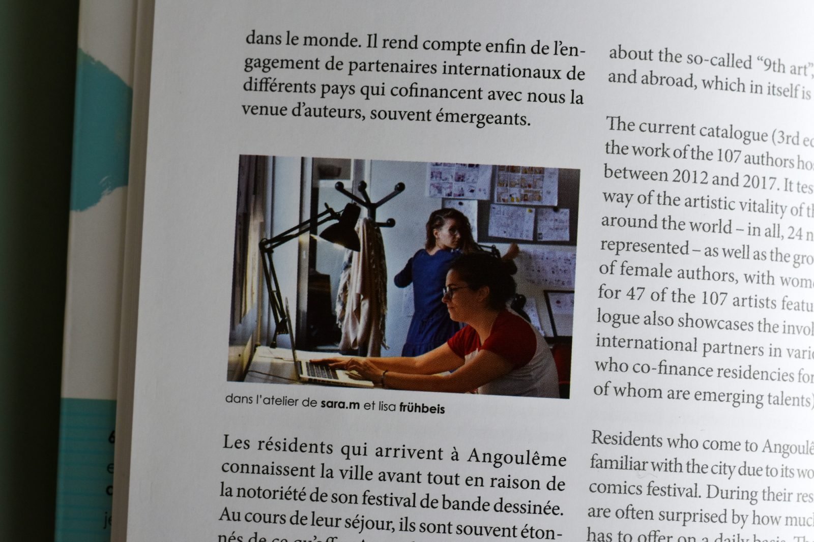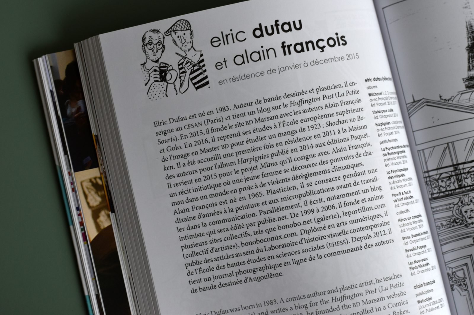 Je suis un peu partout et à plus d’un titre dans le nouveau catalogue qui fait le bilan tous les cinq ans de la résidence d’auteur « La maison des auteurs », à Angoulême : « Cinq ans de résidence 2012-2017 ». J’y suis pour mes photographies qui illustrent largement les différents chapitres. J’y signe aussi un court texte (bilingue) sur mon projet photo et j’y suis présent enfin comme scénariste résident de janvier à décembre 2015…