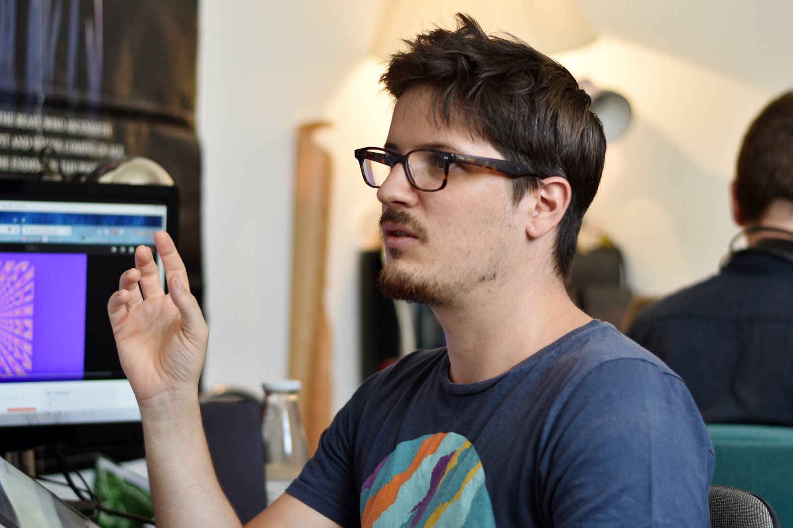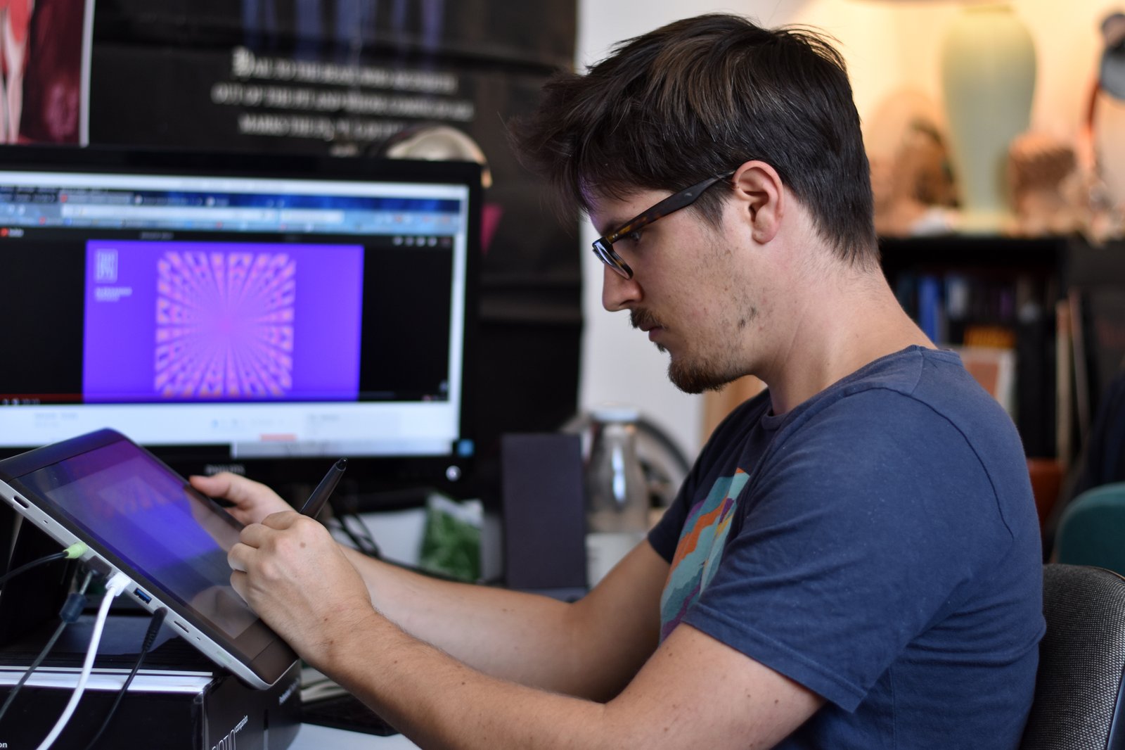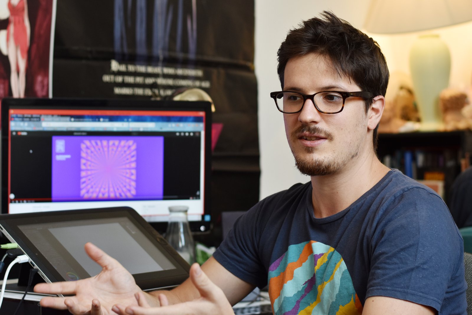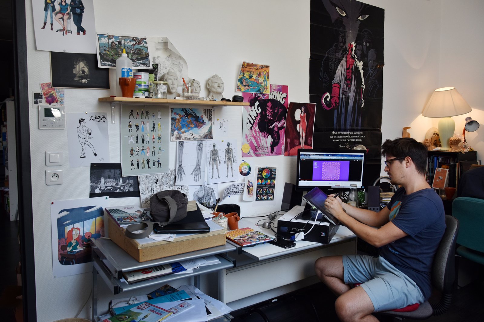 Je suis passé voir Étienne Oburie, dessinateur de bande dessinée, à l’occasion de la parution récente de son premier livre : « La mort aux yeux de cristal » sorti en juin 2018 chez Glénat. le scénario est d’Hamelin. Inspiré de l’atmosphère des films de Dario Argento, c’est un thriller qui glisse vers le fantastique et qui se présente lui-même comme une version BD d’un « Giallo« , le genre des polars fantastiques et érotiques italiens. Je n’ai pas encore eu l’occasion de le lire, mais la référence aux « Giallo » est intrigante. En attendant, le dessinateur dans son atelier :