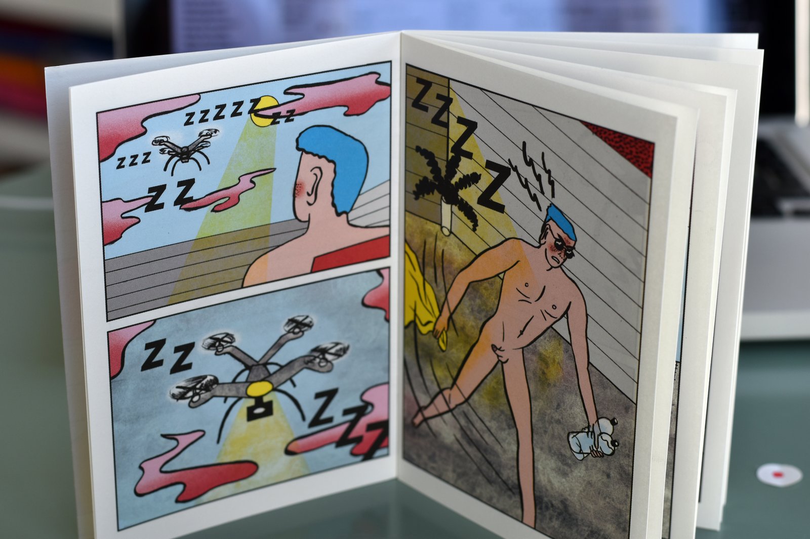 Voilà «EYEZ» d’Aisha Franz, illustratrice et autrice de bande dessinée allemande, le #41 de la trop mignonne collection des « Mini Kuš! », mini-graphzine A6 de l’éditeur Letton Kuš!, fondée en 2007 à Riga. Un petit conte moderne, coloré, pop et drôle sur la surveillance globale, avec une femme dans la peau d’un homme, un drone voyeur, et une évasion virtuelle…