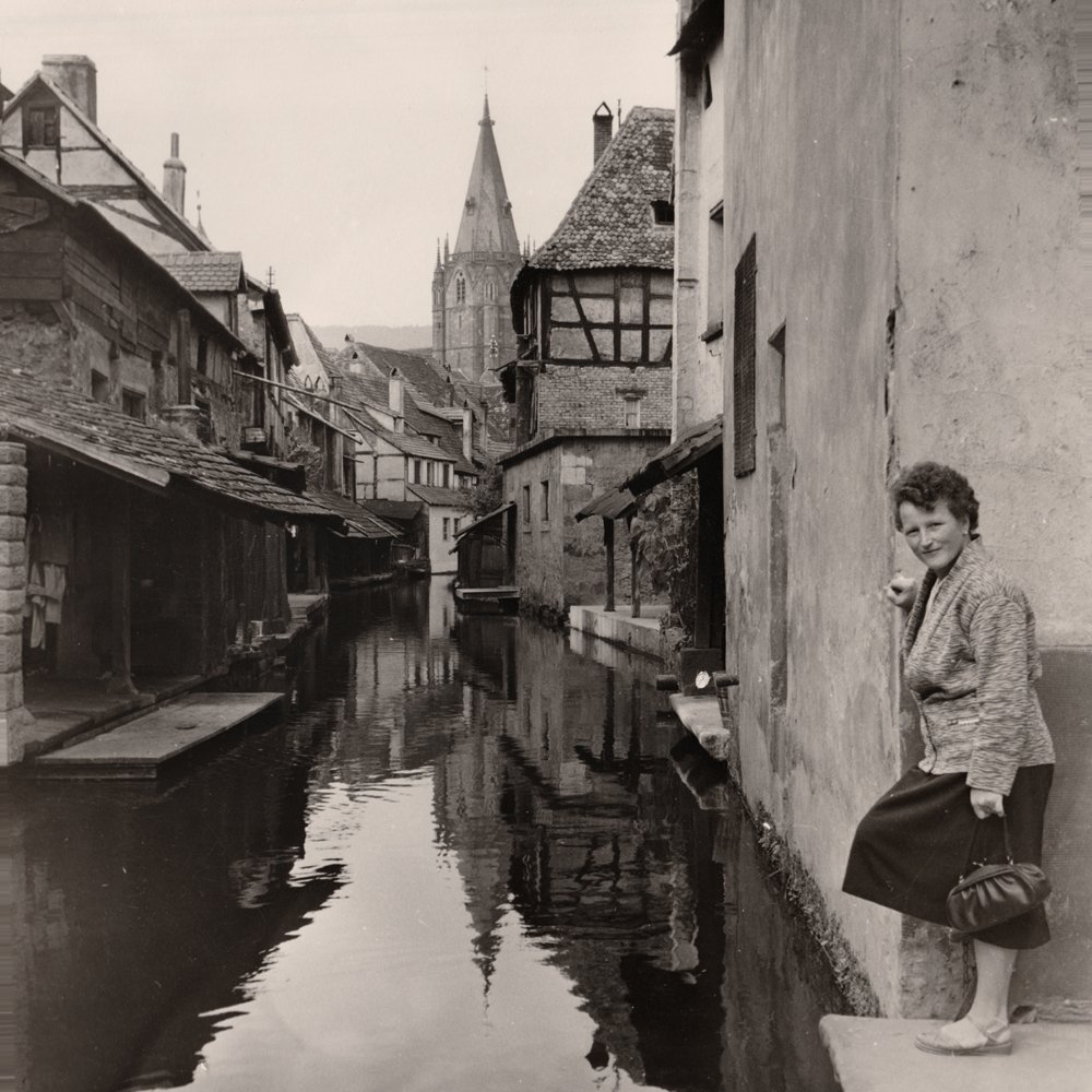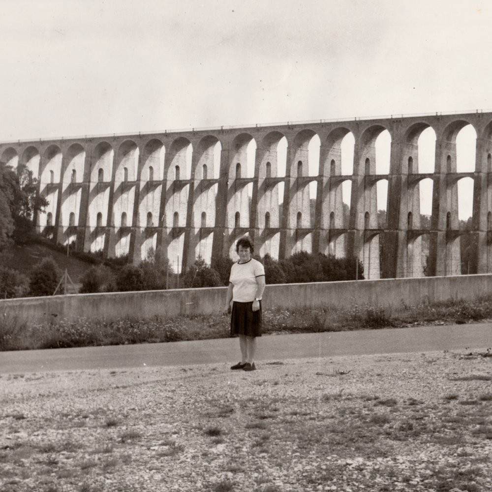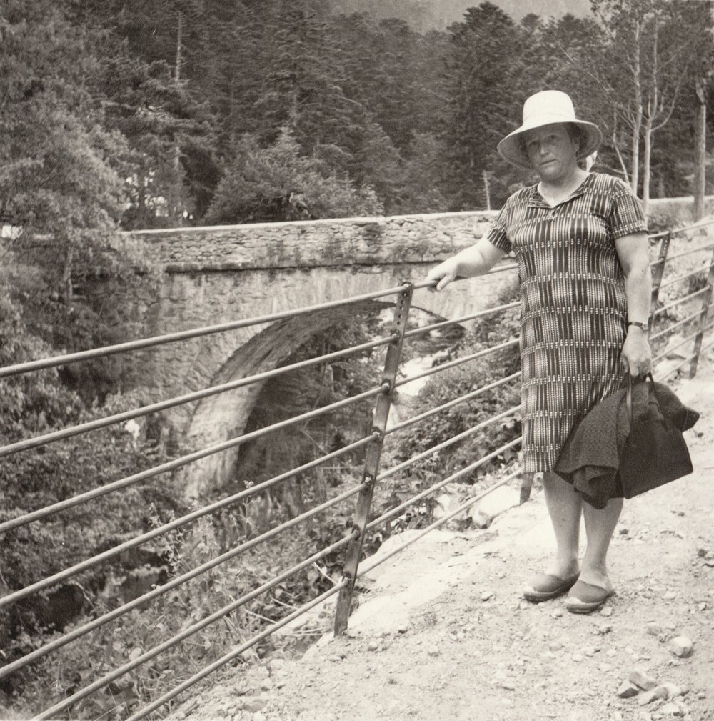 Bien avant le selfie (cette photo qui dit, entre autres, « je suis là »), ma grand-mère paternelle était déjà là, et là, et là encore, et ici aussi… avec la complicité de mon grand-père photographe amateur. Dans les archives photo de ce dernier, je suis tombé sur cette série de tirages papier de paysages incluant systématiquement ma grand-mère. Photos carrées, 6X6, ce qui indique un mouvement particulier du photographe, penchant la tête sur une image déjà là. Le format 6X6 produit des images volontaires, très cadrées, en légère contre-plongée puisque l’appareil est tenu plus bas qu’un reflex.