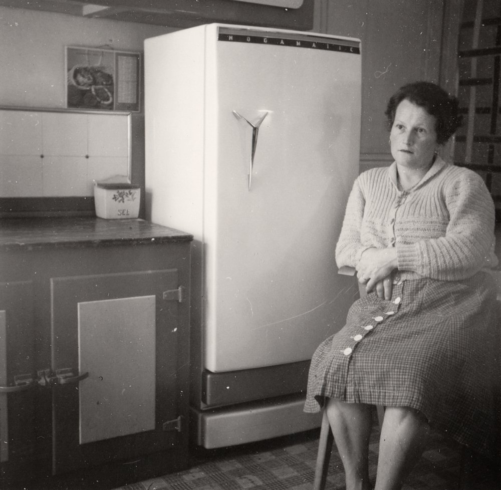 Au grès de mon tri, J’ai trouvé une matrice antérieure à cette série de photo de vacances française, deux photographies d’après-guerre qui annoncent la série de paysage, d’une certaine manière. Ma grand-mère, toujours elle, devant des objets, et pas n’importe quels objets : devant des preuves d’accessions à. Voilà deux photographies qui disent « j’ai ça », mais qu’il faut entendre plus précisément comme « j’ai ça maintenant ». Ces photographies-là ne sont pas drôles. Du moins, elles ne me font pas rire, et portent même leur lot de tragique social. Je ne leur trouve pas la légèreté de la série ultérieure des paysages.