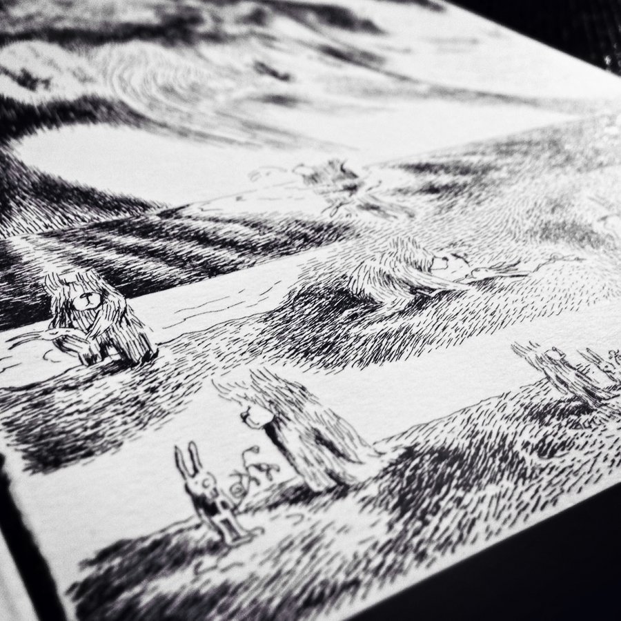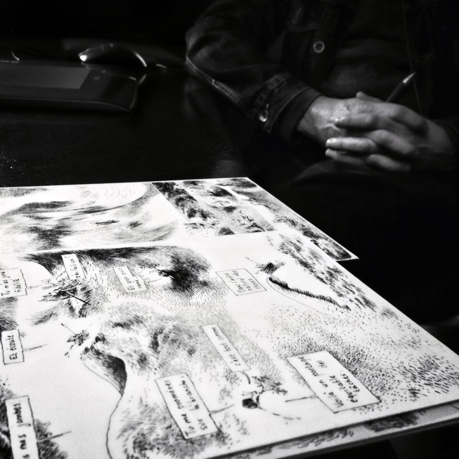 Ce n’est qu’après cette promenade à travers ses paysages imaginaires qu’il me montre enfin quelques planches de bande dessinée. Là, des personnages !