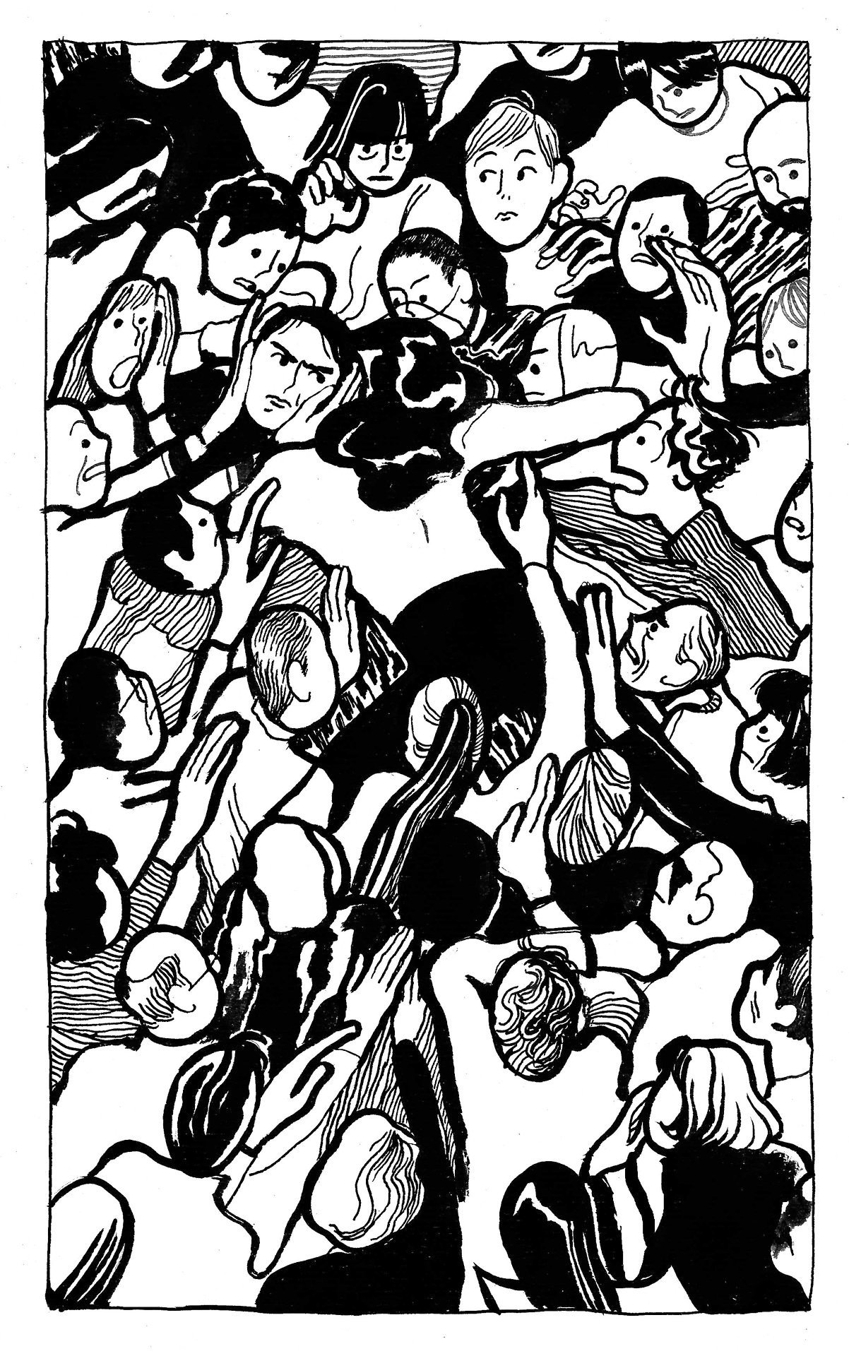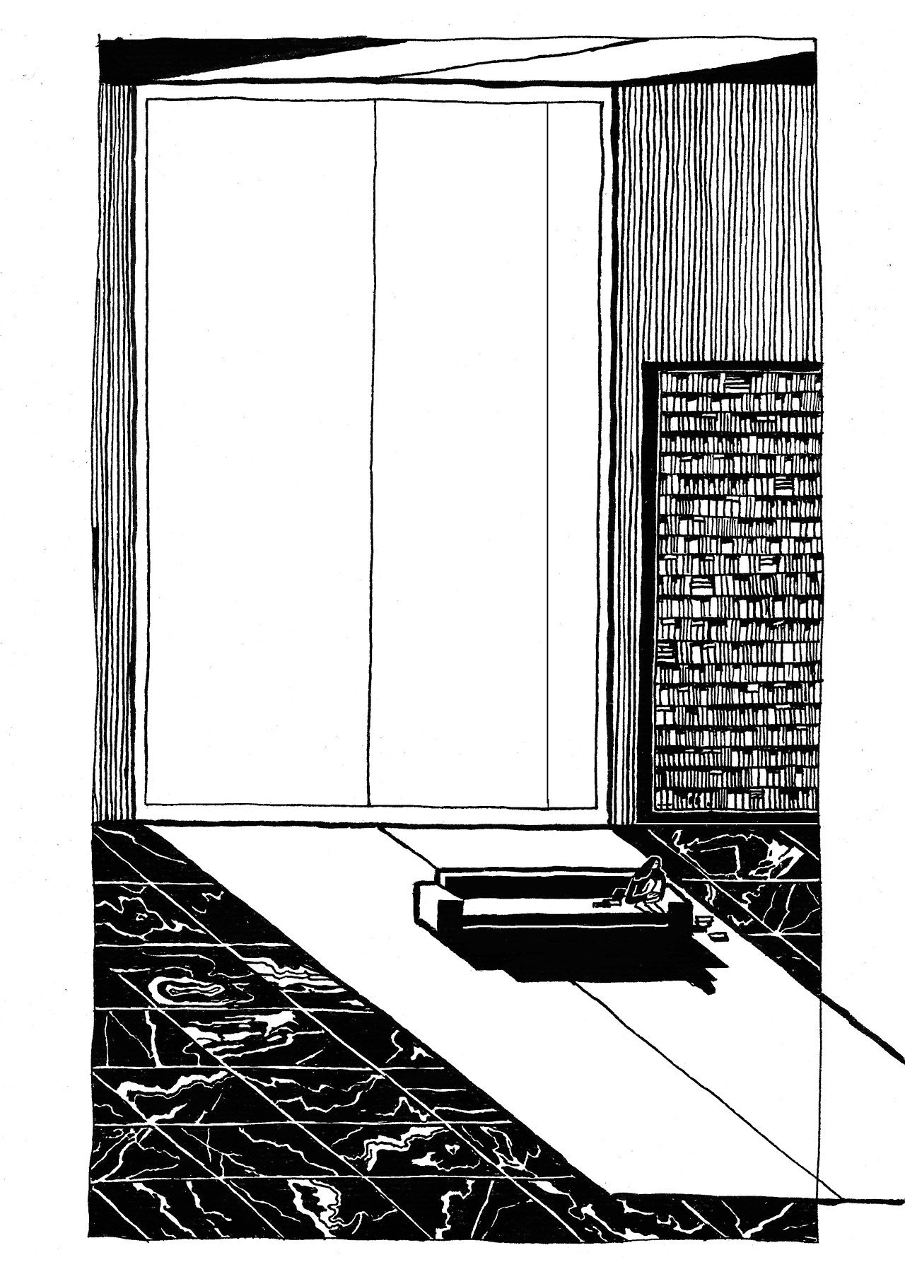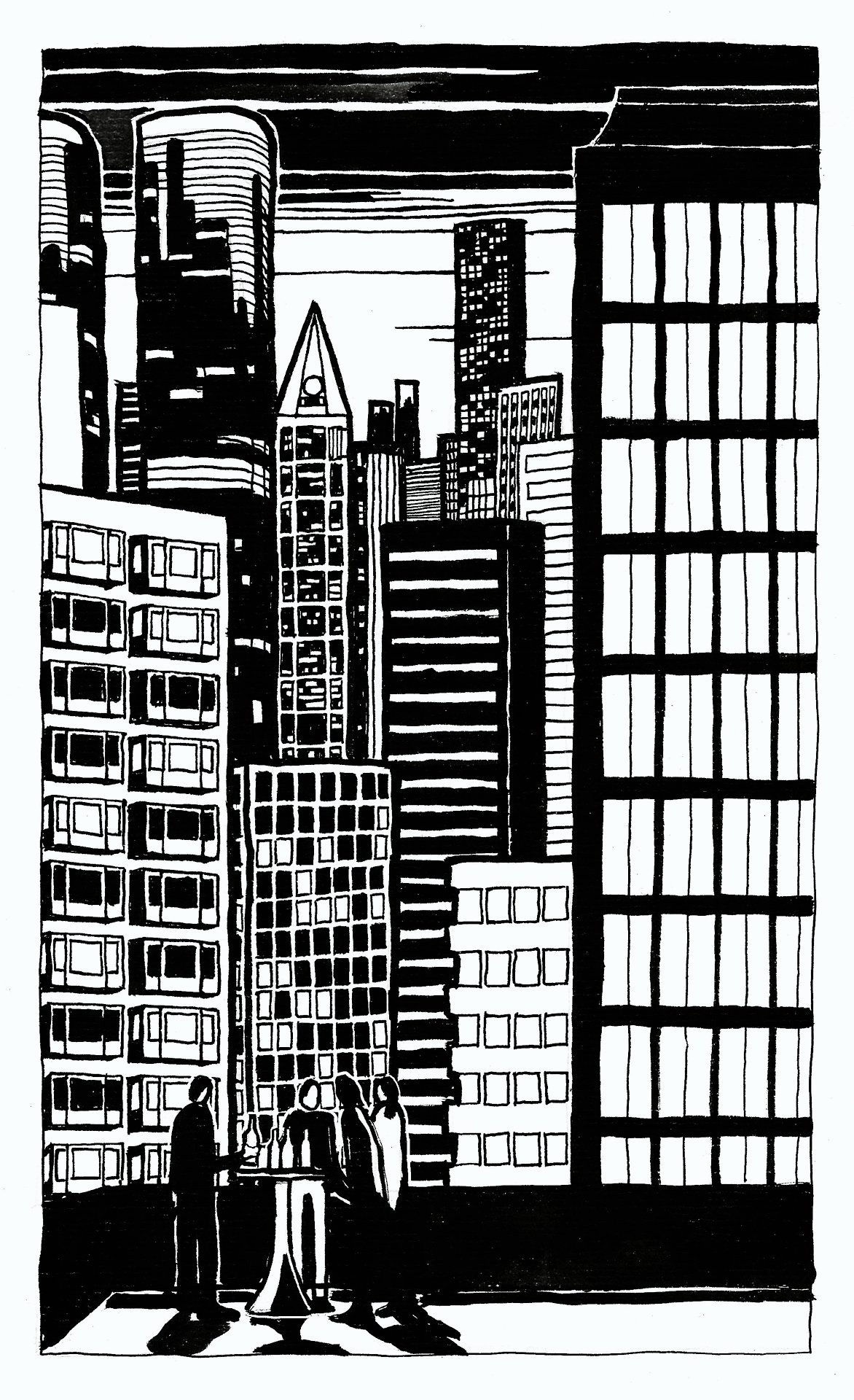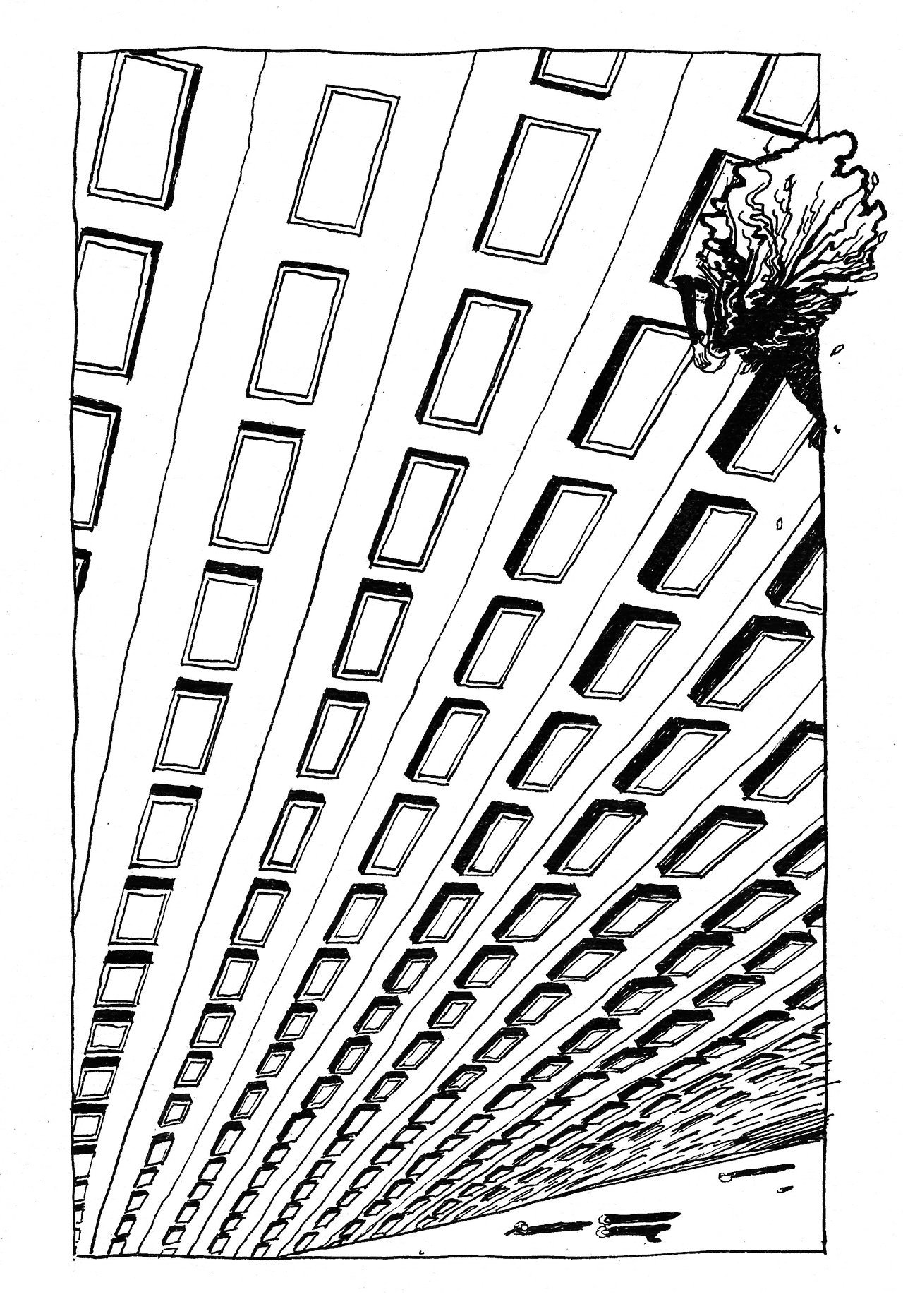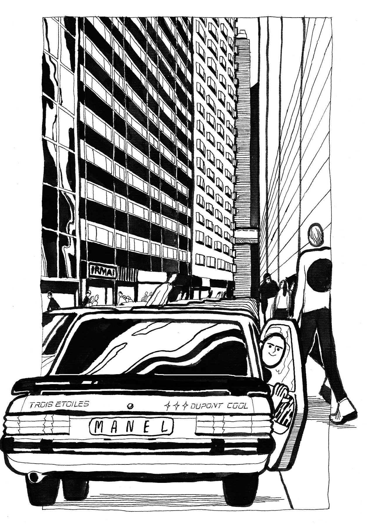 Quoi qu’il en soit, cette série est une réussite par son style très affirmé, par sa manière de remplir le cadre, par les déformations libres et les élongations de personnages… Mais aussi par cette manière chaque fois juste de confronter le corps à l’urbanisme en jouant sur les scansions, les perspectives et les symétries des architectures. On pourrait encore évoquer Sempé (ou plutôt Sempé pompant Chas Addams) ou « la Ville » de Frans Masereel, mais les images de Léa Murawiec ont déjà une personnalité qui n’appartient qu’à elles.