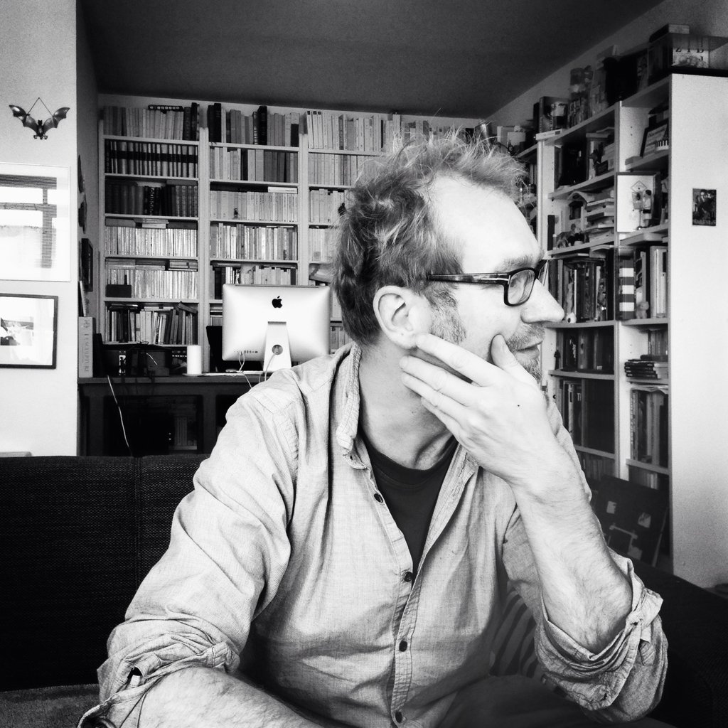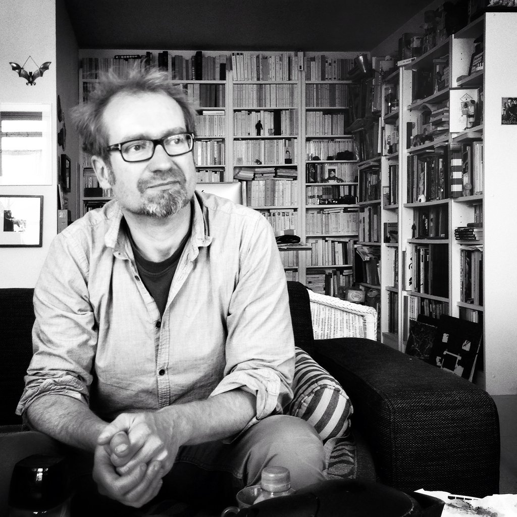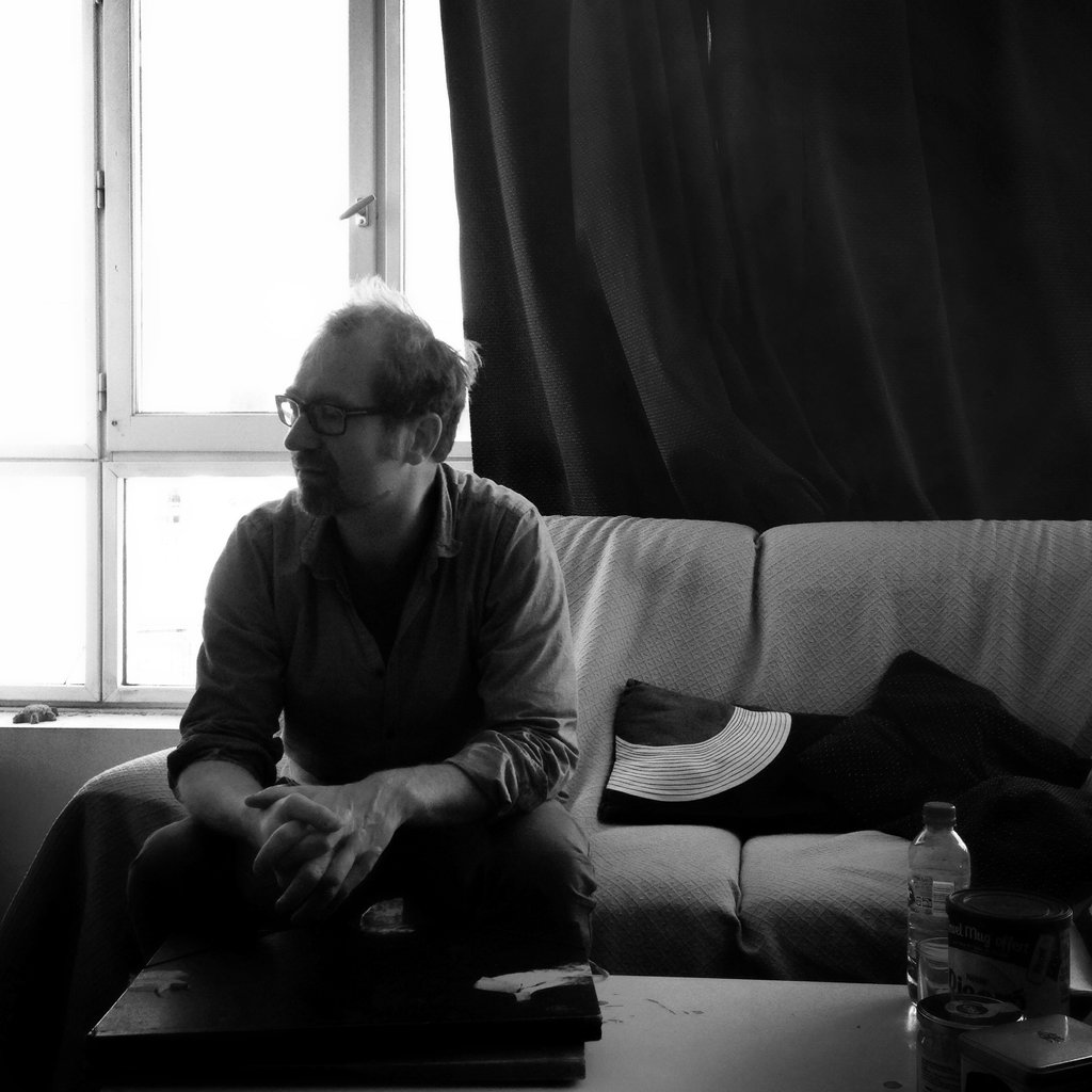 Ludovic Levasseur, artiste, sculpteur (des poupées viandes) et graveur, de passage par chez nous. Sur la photo, dessous, avec Céline Guichard, de dos :