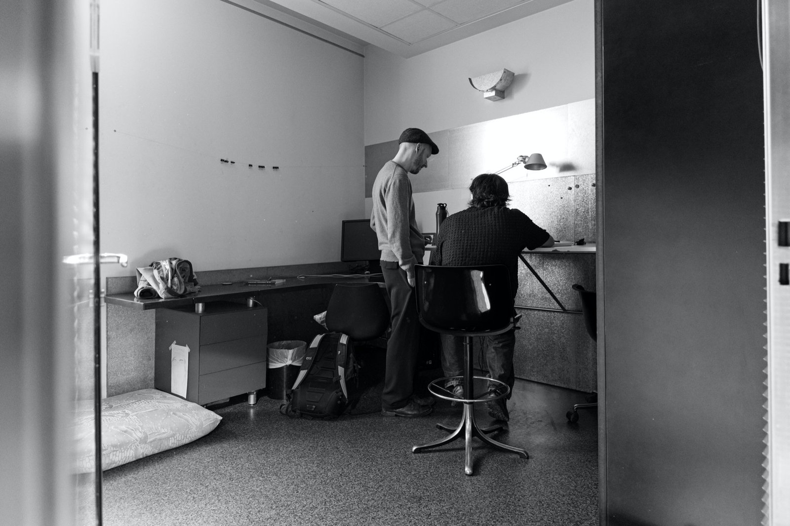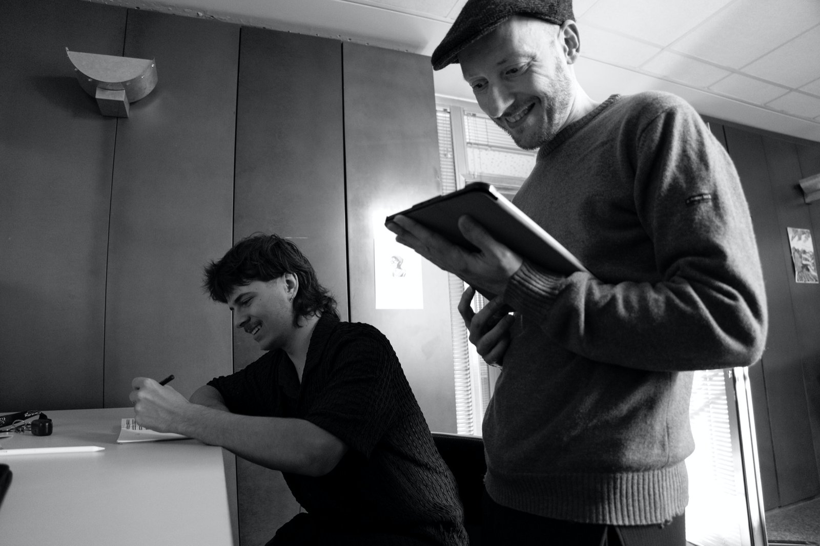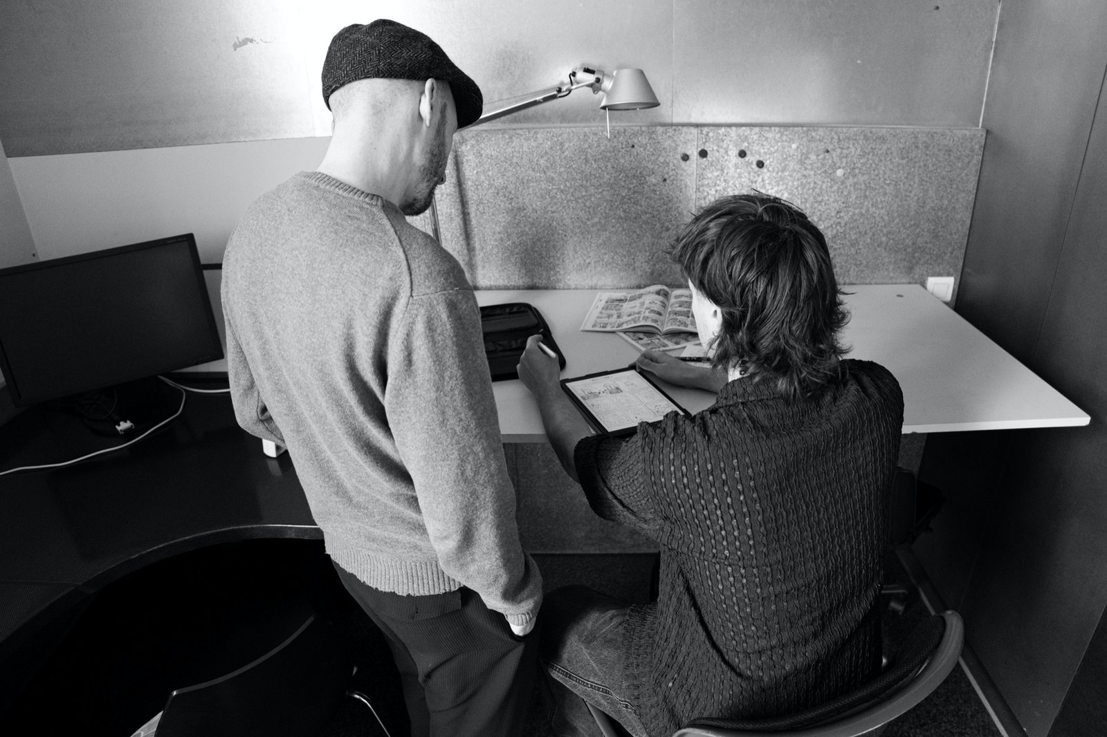 Avec Elric Dufau, nous sommes passé voir « Tibali » (Lilian), un jeune auteur actuellement en résidence à la maison des auteurs, et qui, accessoirement, est aussi un ancien élève d’Elric ! ET qui EN PLUS, est installé dans l’atelier que nous partagions en 2015 avec Elric !