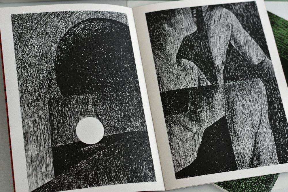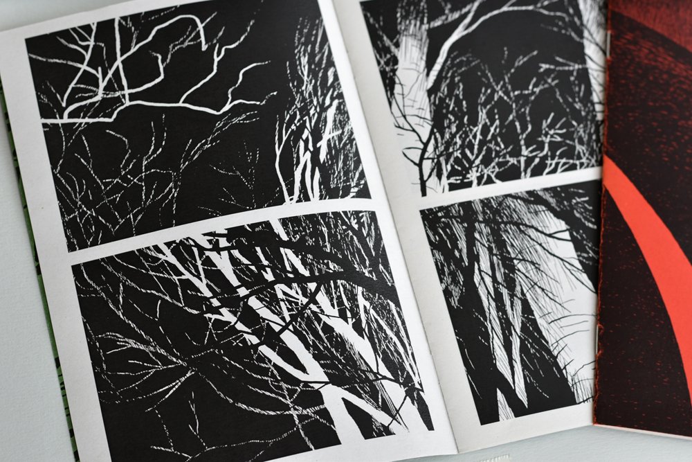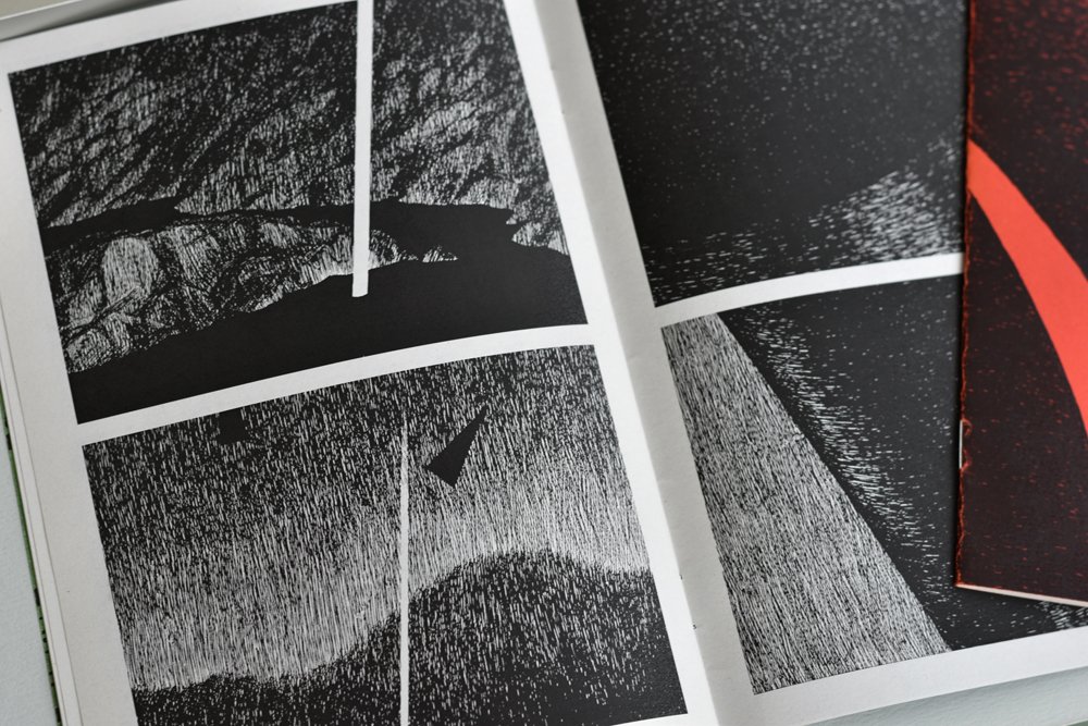 C’est donc le Nº 5 et 8 de We all go down, fanzine de 12 pages A5 noir et blanc édité par le label bruxellois Habeas Corpus. Chaque livraison est entièrement dessinée par un auteur qui doit y être « anonyme »… c’est raté pour moi pour les Nº 5 et 8, donc, selon une contrainte « sombre ». Rigueur, simplicité, pauvreté des moyens et résultat épatant. Pour les Nº que je possède, donc réalisés par Freddy, récit presque abstrait et muet, en deux cases par page (dispositif narratif des « petits formats »), c’est absolument superbe.
